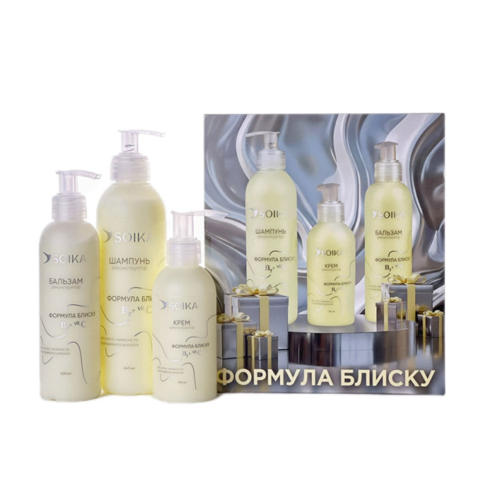 Я - набор для волос Soika "Формула блеска", созданный как полноценная система ухода для волос, которые утратили блеск, мягкость и ухоженный вид. Я работаю поэтапно - от очищения до восстановления и ухода по длине, чтобы волосы выглядели более гладкими, эластичными и сияющими.