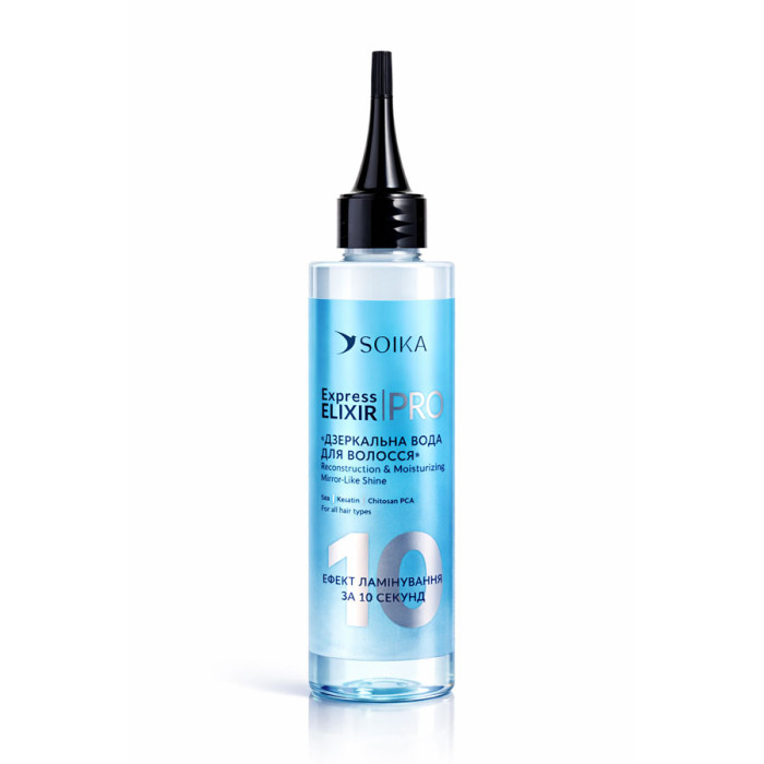 Я - експрес-еліксир Soika "Дзеркальна вода", створений для тих моментів, коли волоссю потрібен миттєвий ефект гладкості, сяяння та доглянутості. Я працюю швидко - всього за 10 секунд, надаючи волоссю ультрасяючий вигляд з ефектом ламінування без обтяження.